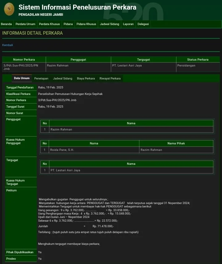 DETAIL.ID, Jambi – Perselisihan pemutusan hubungan kerja oleh PT Lestari Asri Jaya (LAJ) terkait Pemutusan Hubungan Kerja (PHK) terhadap salah seorang pekerjanya yakni Razim Rahman kini berbuntut panjang.