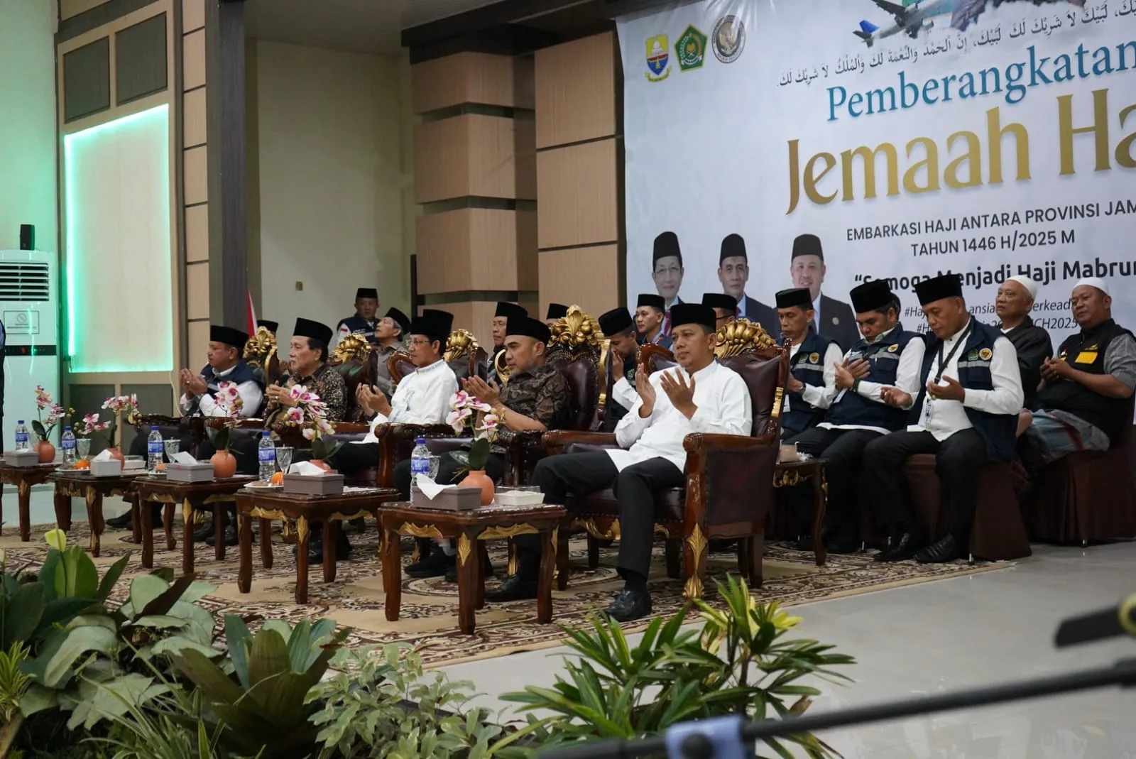 Jambi – Gubernur Jambi yang diwakili oleh Asisten II Sekda Provinsi Jambi Bidang Perekonomi dan Pembangunan Johansyah, SE, ME melepas secara resmi keberangakatan Jemaah Calon Haji (JCH) yang tergabung dalam Kloter 19 BTH berjumlah 445 (JCH) yang terdiri dari Kabupaten Bungo 209, Kabupaten Tanjung Jabung Barat 229, Kabupaten Muaro Jambi 1 dan petugas haji 6 orang, Provinsi Jambi Tahun 1446 Hijriah/2025 Masehi, bertempat di Asrama Haji Kota Baru, Kota Jambi, Rabu, 21 Mei 2025 pagi.