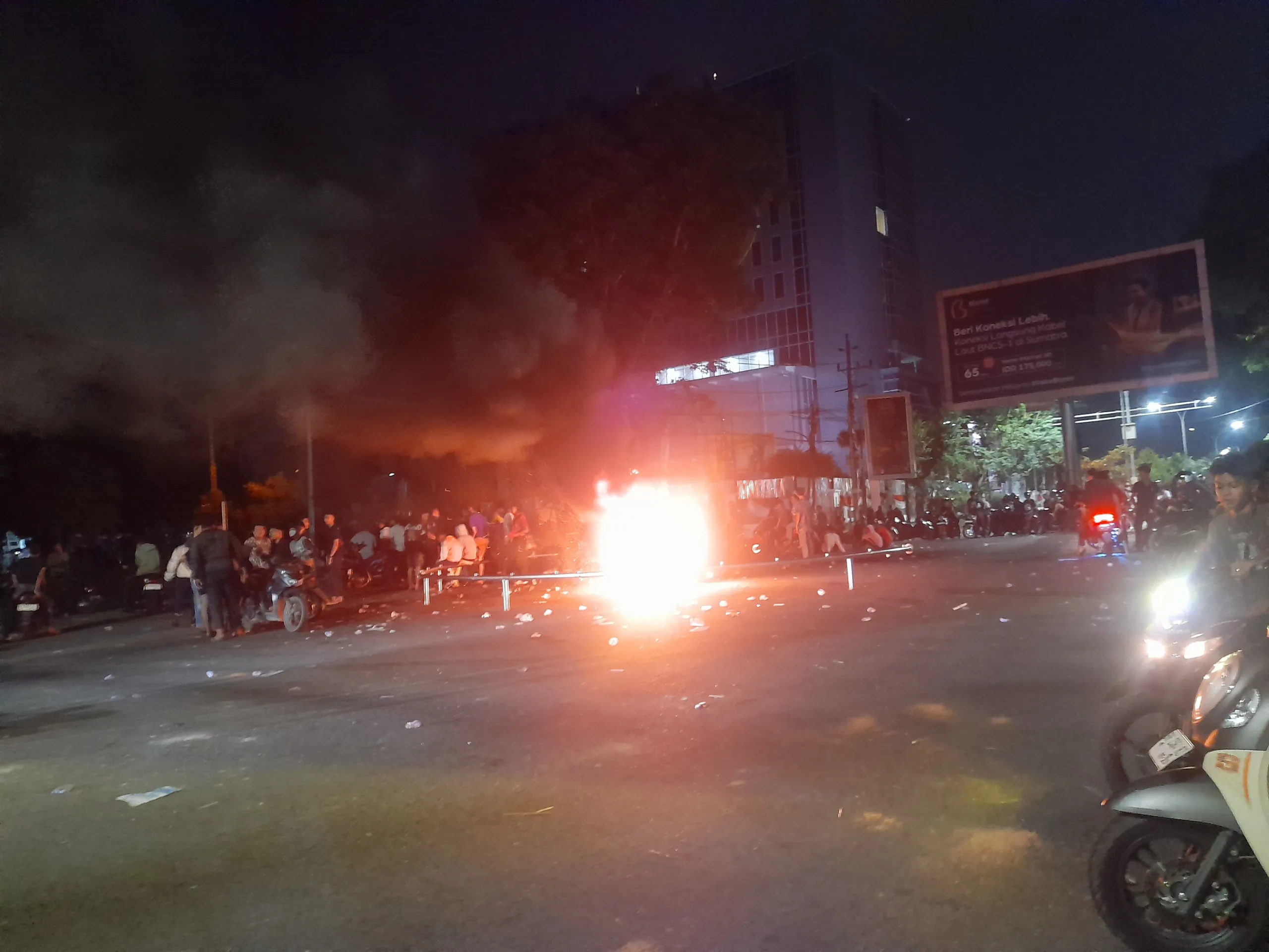 Bentrok antara Polisi dengan masa terus berlangsung bahkan hingga keos. Gas air mata tak membuat massa aksi mundur. Beberapa massa aksi tampak membawa besi-besi yang mereka rusak dari komplek perkantoran Telanai dan memblokade Simpang 4 Bank Indonesia pada malam harinya. Sekira pukul 22.00 WIB, massa membakar pos polisi Simpang BI. Mereka juga membuat api unggun di persimpangan jalan.