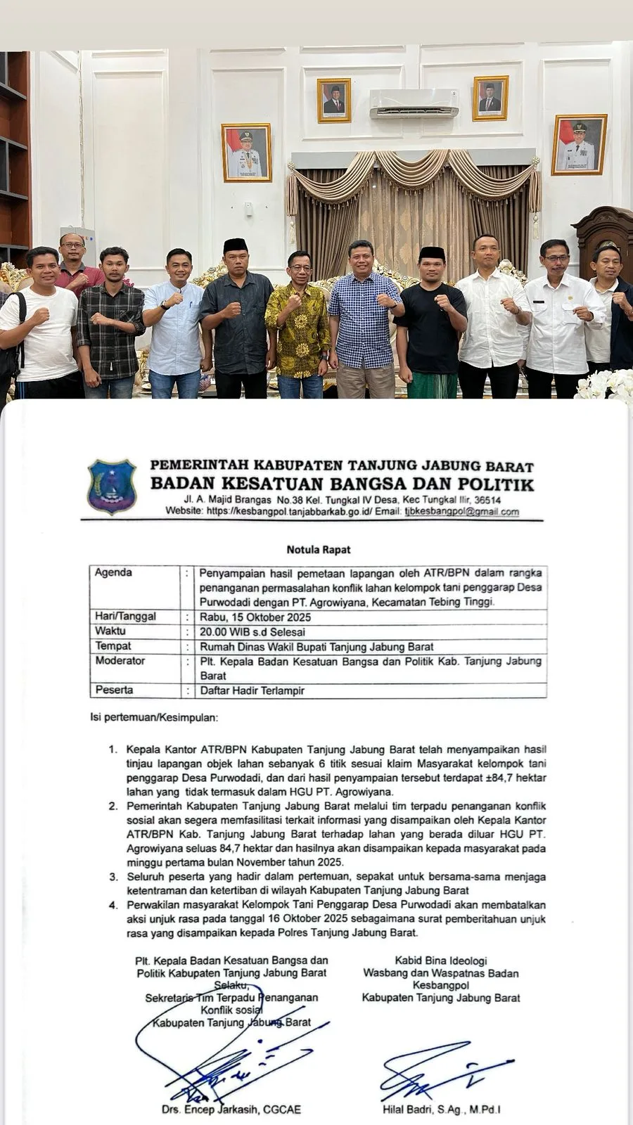 Kepastian tersebut disampaikan dalam rapat koordinasi yang digelar Pemerintah Kabupaten Tanjungjabung Barat melalui Badan Kesatuan Bangsa dan Politik (Kesbangpol) bersama ATR/BPN dan sejumlah pihak terkait, Rabu malam 15 Oktober 2025 di Rumah Dinas Wakil Bupati Tanjab Barat.