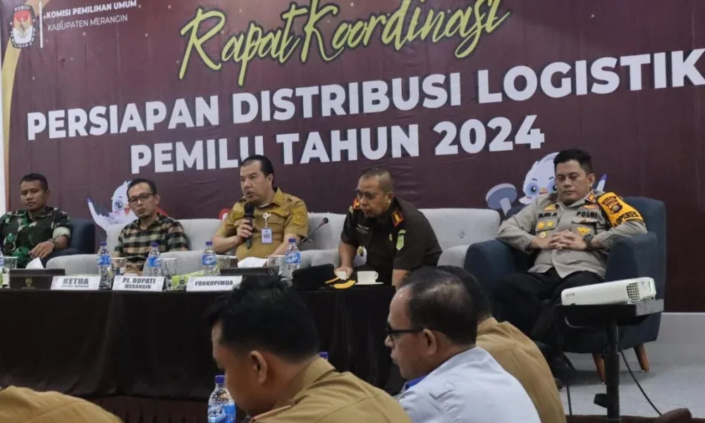 DETAIL.ID, Merangin – Pj Bupati Merangin, H. Mukti didampingi Forkopimda, memimpin jalannya rapat koordinasi (Rakor) persiapan Pemilihan Umum (Pemilu) 2024, di Auditorium Hotel Family Iin Bangko...
