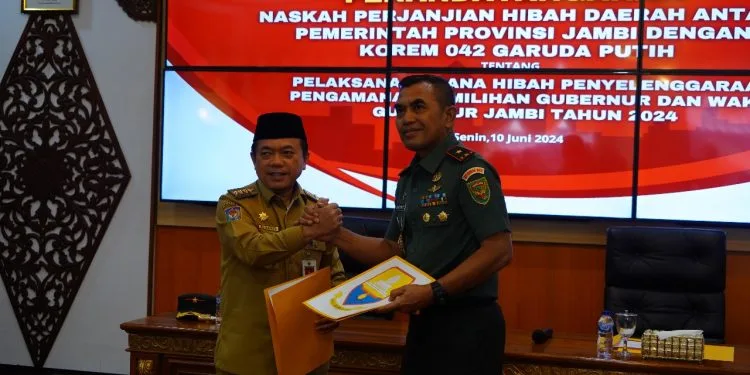 Jambi – Gubernur Jambi Dr. H. Al Haris bersama Danrem 042/Gapu Brigjen TNI Rachmad, S.I.P menandatangani Naskah Perjanjian Hibah Daerah (NPHD) Pengamanan Pilkada tahun 2024 dilaksanakan...