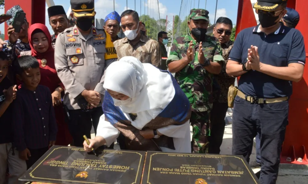 DETAIL.ID, Muarojambi – Bupati Muarojambi Masnah Busro dampingi Staf Ahli Gubenur Jambi meresmikan Jembatan Gantung Putri Ponjen yang terletak di Desa Tanjung Lanjut, Kecamatan Sekernan, Muaro...