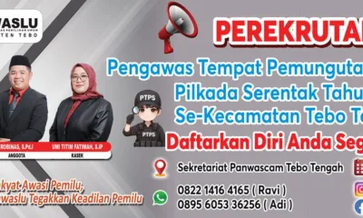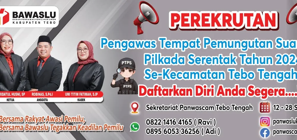 DETAIL.ID, Tebo – Perekrutan Petugas Tempat Pemungutan Suara (PTPS) dilaksanakan oleh Panwaslu Kecamatan Tebo Tengah yang akan ditempatkan pada 63 Tempat Pemungutan Suara (TPS) yang akan...