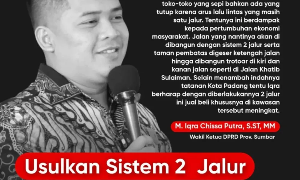 DETAIL.ID, Padang – Wakil Ketua DPRD Provinsi Sumatera Barat (Sumbar), M. Iqra Chissa mengusulkan agar Jalan Pemuda, Padang, tepatnya dari depan Plaza Andalas hingga depan Taman...