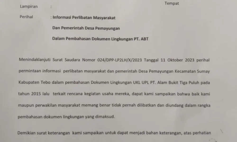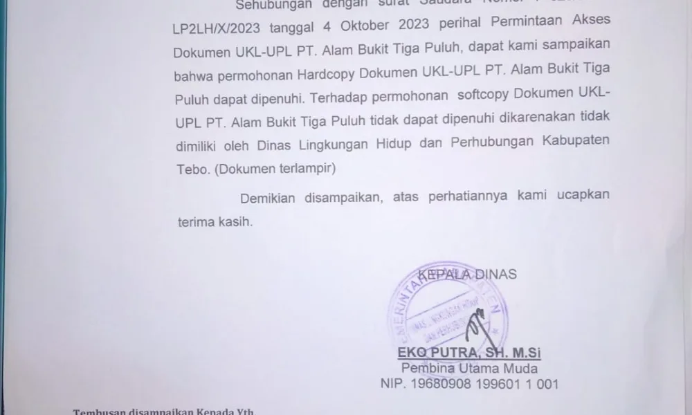 DETAIL.ID, Tebo – Dinas Lingkungan Hidup dan Perhubungan (DLH – Hub) Kabupaten Tebo menanggapi Surat Permintaan Akses informasi dan Dokumen Lingkungan yang dilayangkan DPP Lembaga Pemantau...