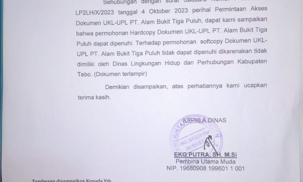 DETAIL.ID, Tebo – Dinas Lingkungan Hidup dan Perhubungan (DLH – Hub) Kabupaten Tebo menanggapi Surat Permintaan Akses informasi dan Dokumen Lingkungan yang dilayangkan DPP Lembaga Pemantau...