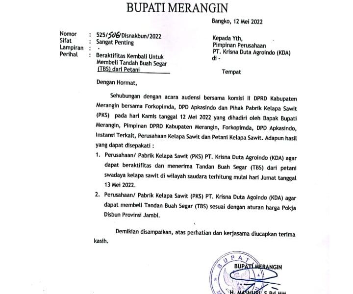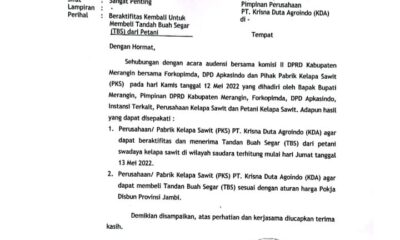 DETAIL.ID, Merangin – PT Krisna Duta Agroindo (KDA) di Kabupaten Merangin, Jambi tampaknya tidak benar-benar berkomitmen penuh dalam melaksanakan kesepakatan yang dihasilkan saat audiensi bersama Komisi...