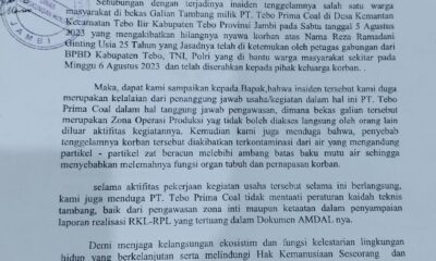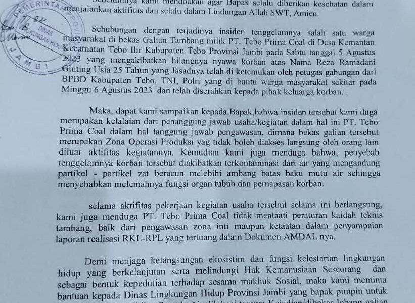 Tebo – Lembaga Pemantau Penyelamat Lingkungan Hidup (LP2LH) secara resmi menyurati Dinas Lingkungan Hidup (DLH) Provinsi Jambi terkait insiden meninggalnya salah seorang warga di lubang bekas...