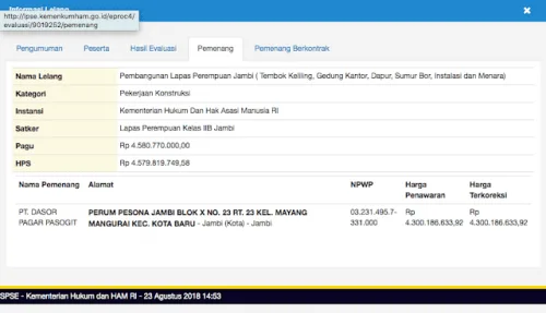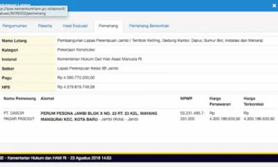 DETAIL.ID, Jambi – Dua tender proyek di Kementerian Hukum dan HAM (Kemenkumham) Provinsi Jambi diduga “diatur” dengan syarat-syarat yang dinilai tak relevan dengan tingkat kesulitan pekerjaan. Alhasil,...
