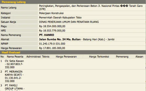 DETAIL.ID, Tebo – PT Hanro ternyata tidak hanya menang tender di proyek APBN tahun 2018, melainkan juga menang tender pada paket pekerjaan lain. Nilai paketnya cukup fantastis...