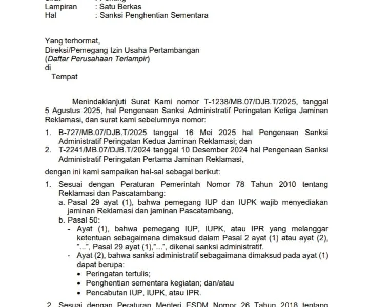 DETAIL.ID, Jakarta – Direktorat Jenderal Mineral dan Batubara (Ditjen Minerba) Kementerian Energi dan Sumber Daya Mineral (ESDM) resmi menjatuhkan sanksi penghentian sementara terhadap ratusan perusahaan pemegang...