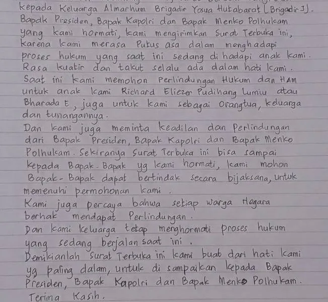 detail.id/, Jakarta – Kedua orang tua Richard Eliezer Pudihang Lumiu atau Bharada E memohon perlindungan kepada Presiden Republik Indonesia melalui surat terbuka. Surat dengan tulisan tangan...