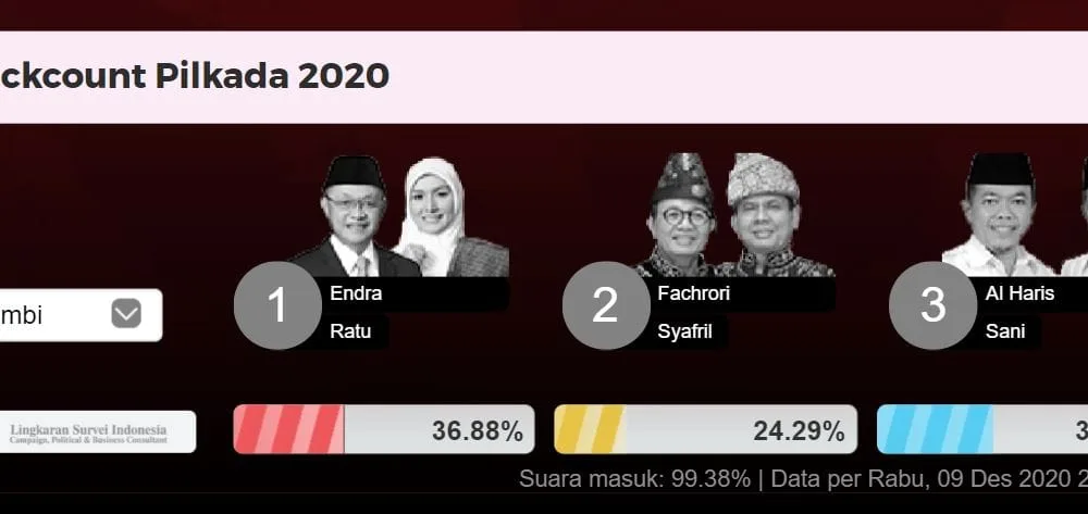 detail.id/, Jambi – Pasangan Cagub-Cawagub Jambi, Al Haris-Abdullah Sani, sah menang Pilgub Jambi 2020 berdasar quick count Lingkaran Survei Indonesia (LSI) pukul 99,38 persen. Update data...