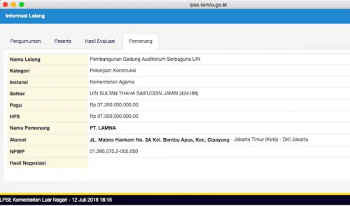 DETAIL.ID, Jambi – Tender gede terkadang justru jadi bancakan. Perusahaan pemenang tak terdaftar resmi, aturan mengada-ngada dan ironisnya tender gede justru diumumkan di portal yang tak relevan. Tak percaya? Tengoklah tender gede Universitas...